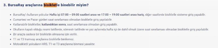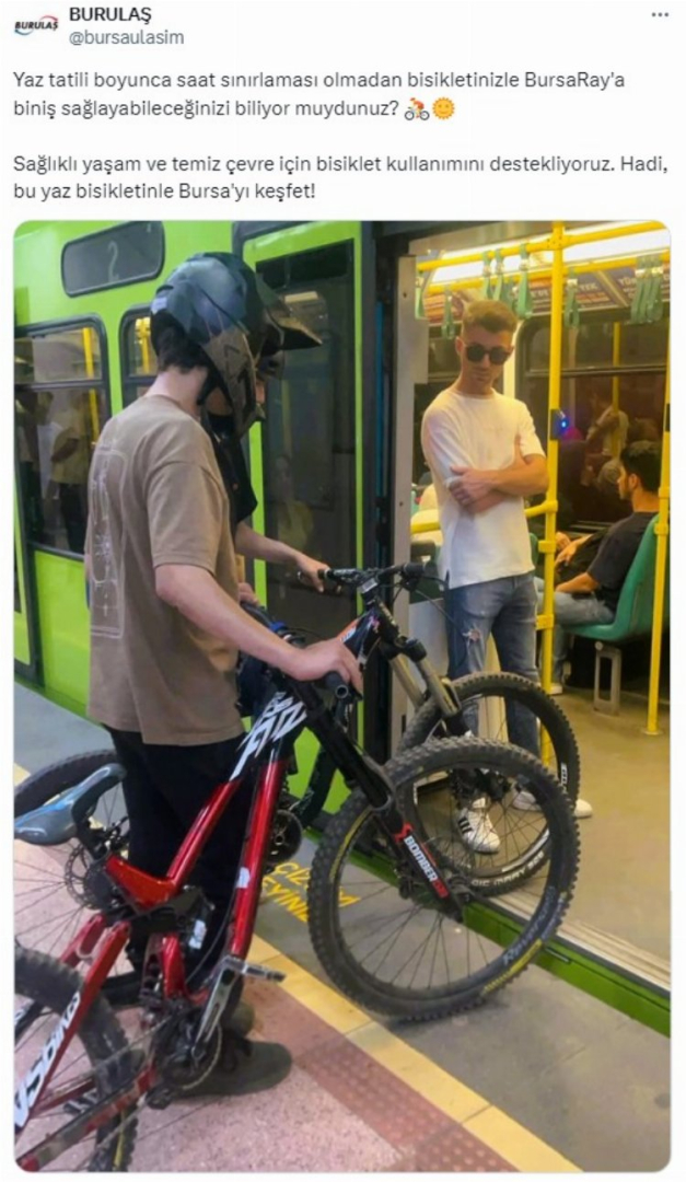 BURULAŞ tarafından yapılan açıklamada, "Yaz tatili boyunca saat sınırlaması olmadan bisikletinizle BursaRay'a biniş sağlayabileceğinizi biliyor muydunuz? Sağlıklı yaşam ve temiz çevre için bisiklet kullanımını destekliyoruz. Hadi, bu yaz bisikletinle Bursa'yı keşfet!" ifadelerine yer verildi.