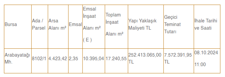 Bursa Büyükşehir Belediyesi şirketlerinden Bursa Kent Yapı İmar Bilişim Enerji Sanayi ve Ticaret Anonim Şirketi, 4 bin 423 metrekarelik arsada kat karşılığı inşaat işi yapılması için bir kez daha ihale açtı.