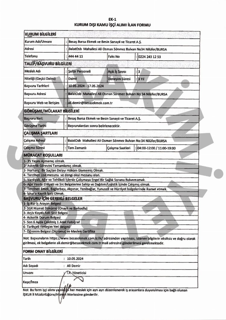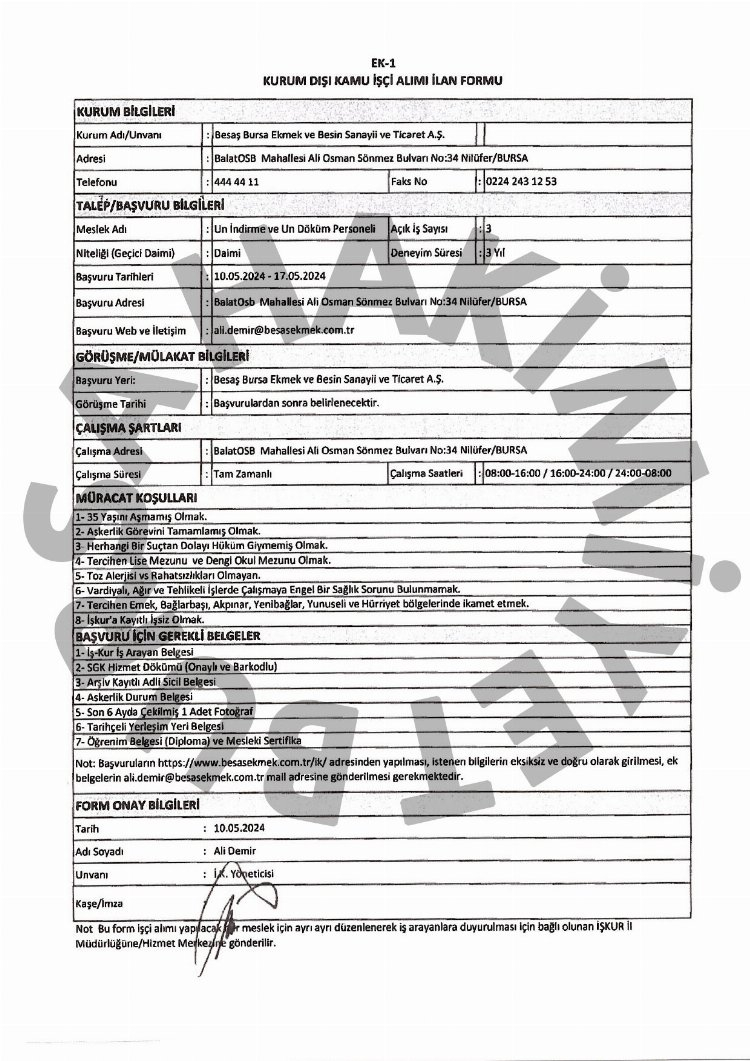 10 Mayıs ile 17 Mayıs tarihleri arasında yapılacak iş başvuruları, ali.demir@besasekmek.com.tr mail adresine gönderilecek.