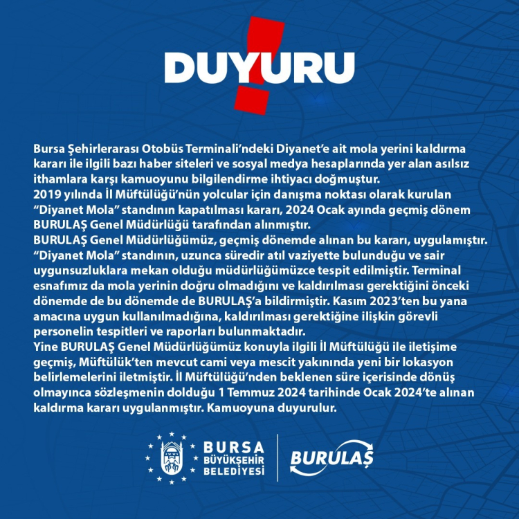 Bursa Büyükşehir Belediyesi'nin ulaşım işletmesi BURULAŞ, söz konusu iddiaların ve Bursa Müftülüğü'nün açıklamasının aksine Diyanet Mola standının kapatılması kararının 2024 Ocak ayında geçmiş dönem BURULAŞ Genel Müdürlüğü tarafından alındığını duyurdu.