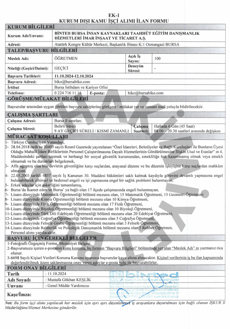 Bugün sona erecek iş ilanına, biko@bursabiko.com mail adresi üzerinden başvuru yapılabilecek.