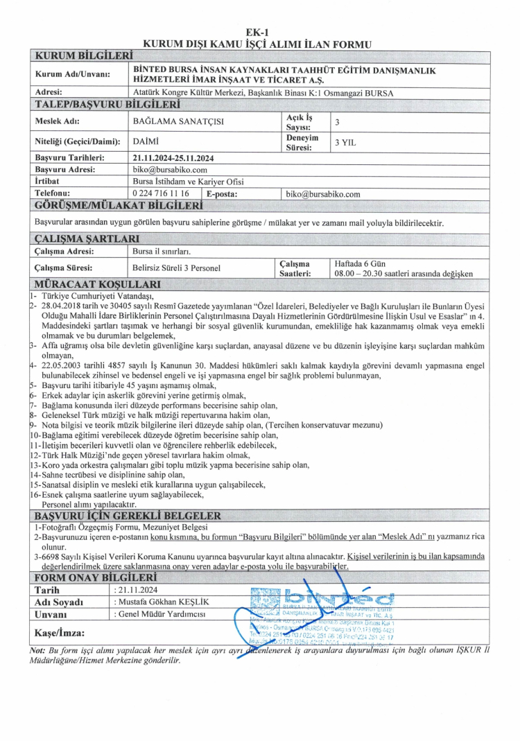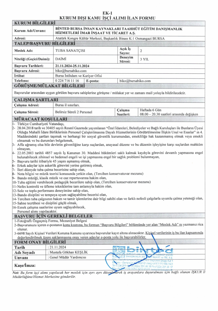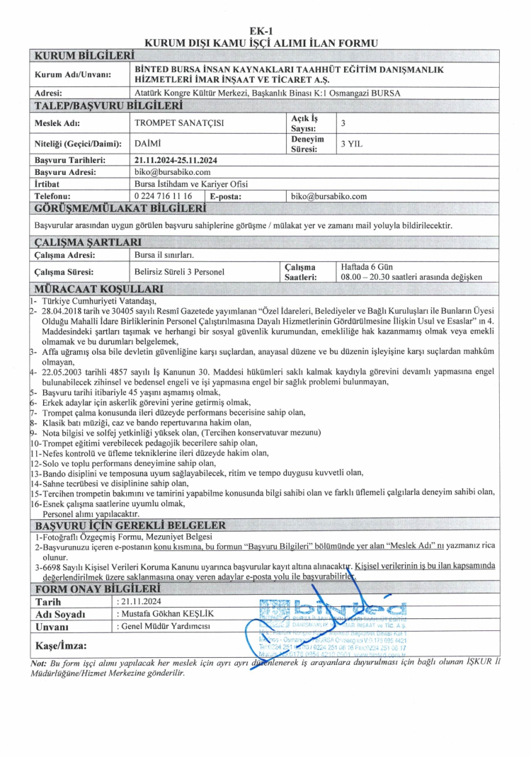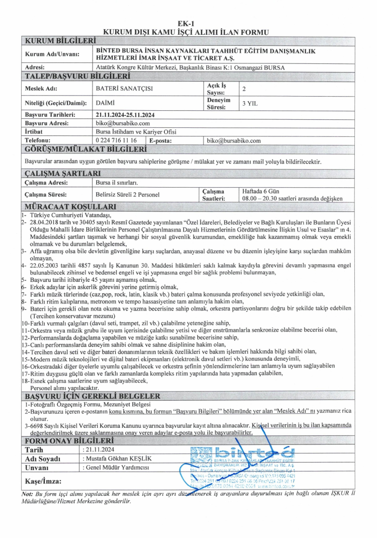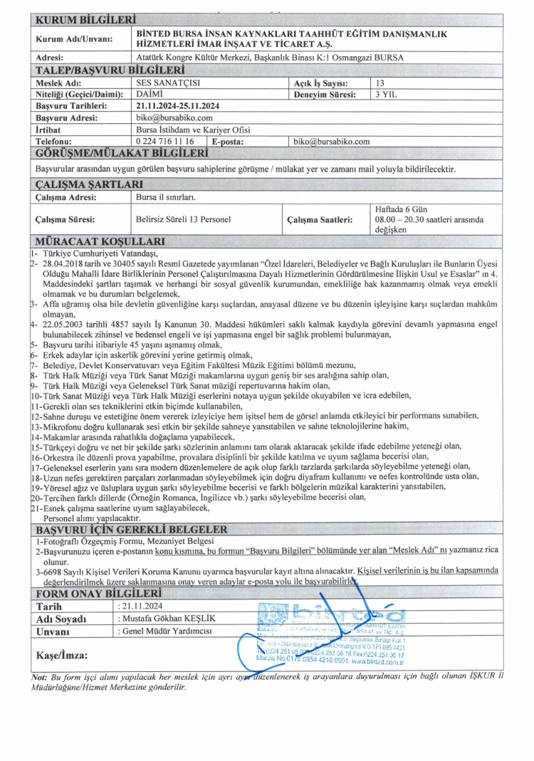 21 Kasım Perşembe günü başvuruya açılan iş ilanlarına 25 Kasım Pazartesi gününe kadar Bursa İstihdam ve Kariyer Ofisi'nin biko@bursabiko.com mail adresinden başvuru yapılabilecek.
