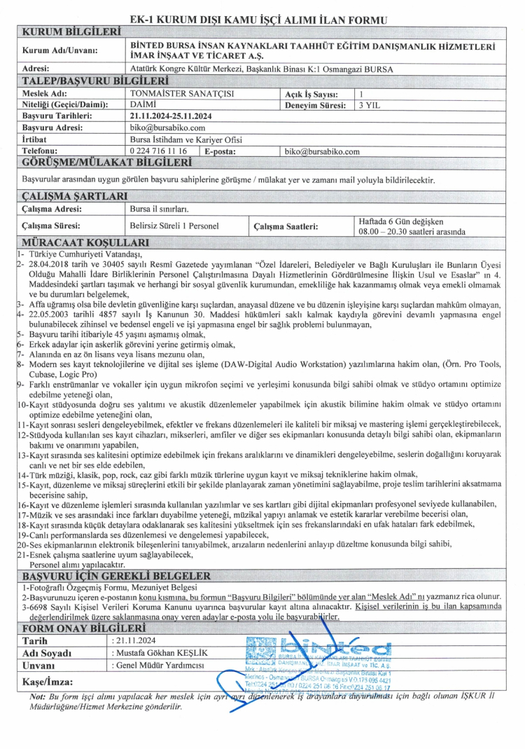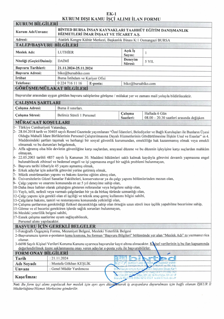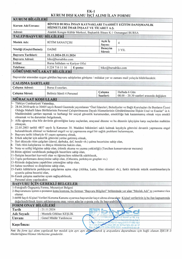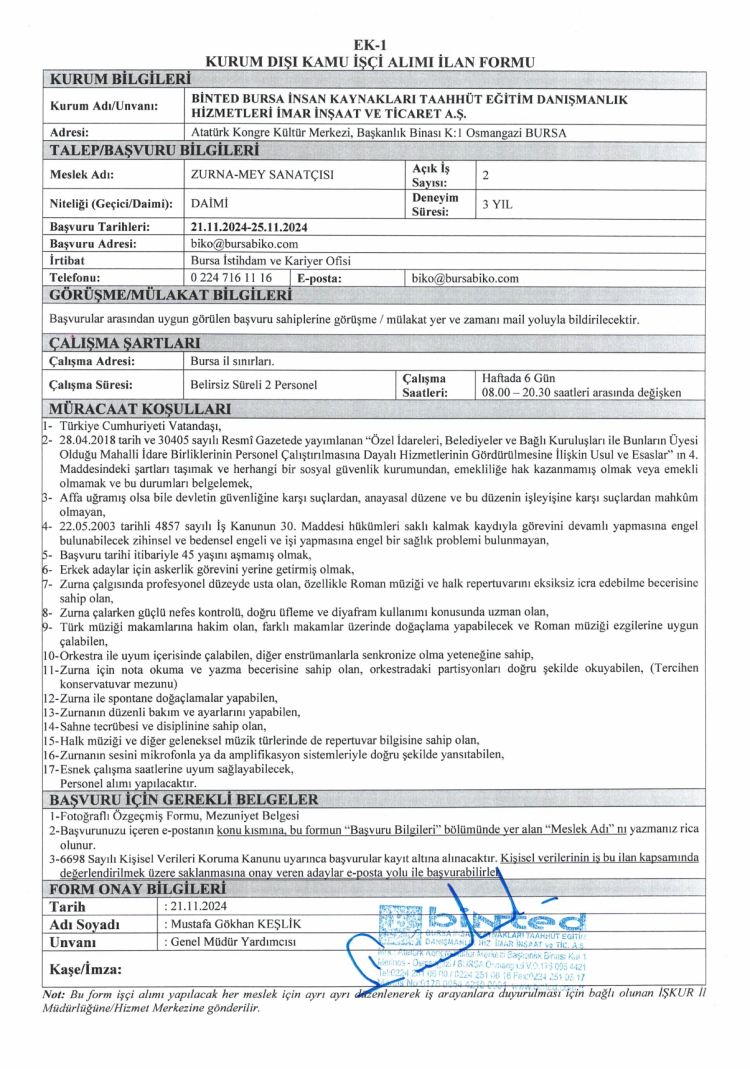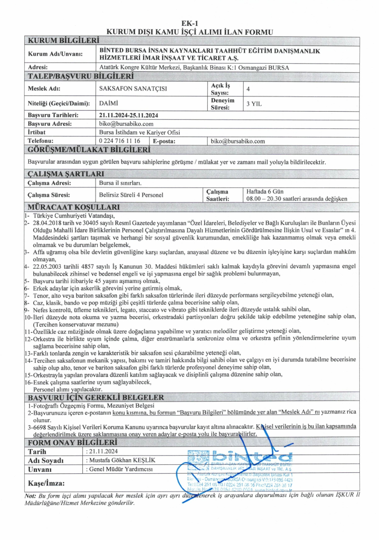 21 Kasım Perşembe günü başvuruya açılan iş ilanlarına 25 Kasım Pazartesi gününe kadar Bursa İstihdam ve Kariyer Ofisi'nin biko@bursabiko.com mail adresinden başvuru yapılabilecek.