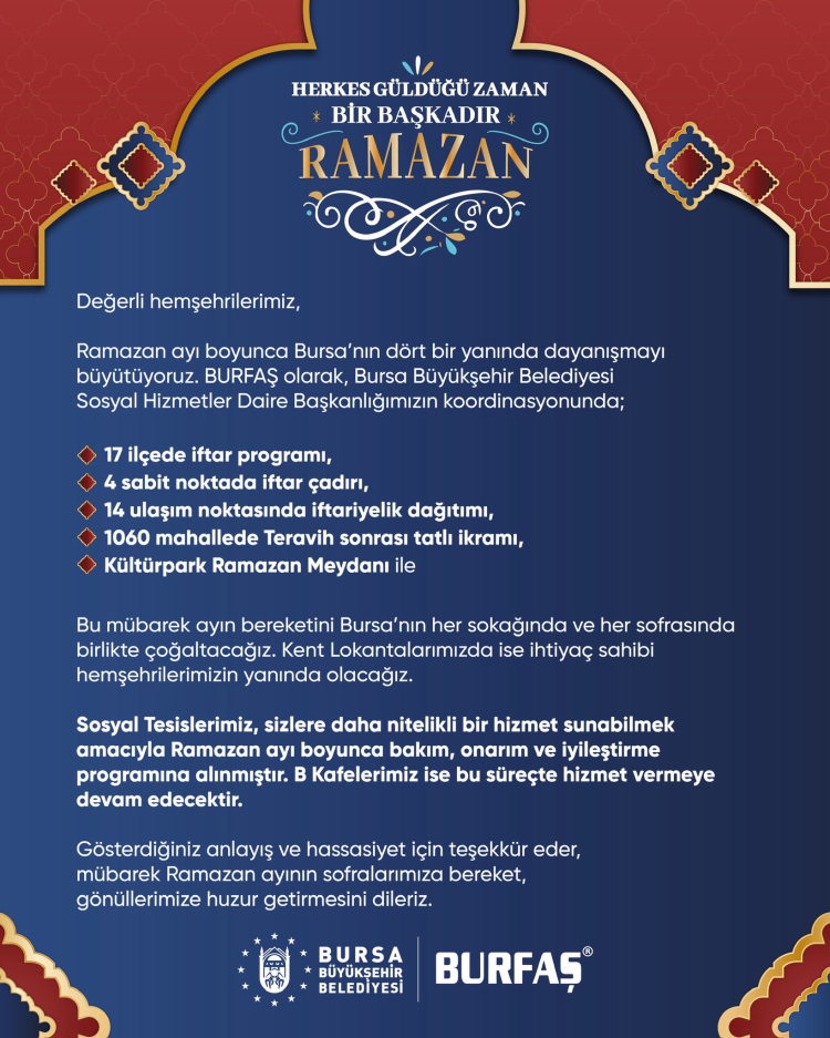 Belediye iştiraklerinden BURFAŞ koordinasyonunda yürütülecek program kapsamında; 17 ilçede iftar organizasyonları düzenlenecek, 4 sabit noktada iftar çadırı kurulacak, 14 ulaşım noktasında iftariyelik dağıtımı yapılacak ve 1060 mahallede teravih namazı sonrası tatlı ikramı gerçekleştirilecek. Ayrıca Kültürpark’ta Ramazan Meydanı etkinlikleri düzenlenecek.
