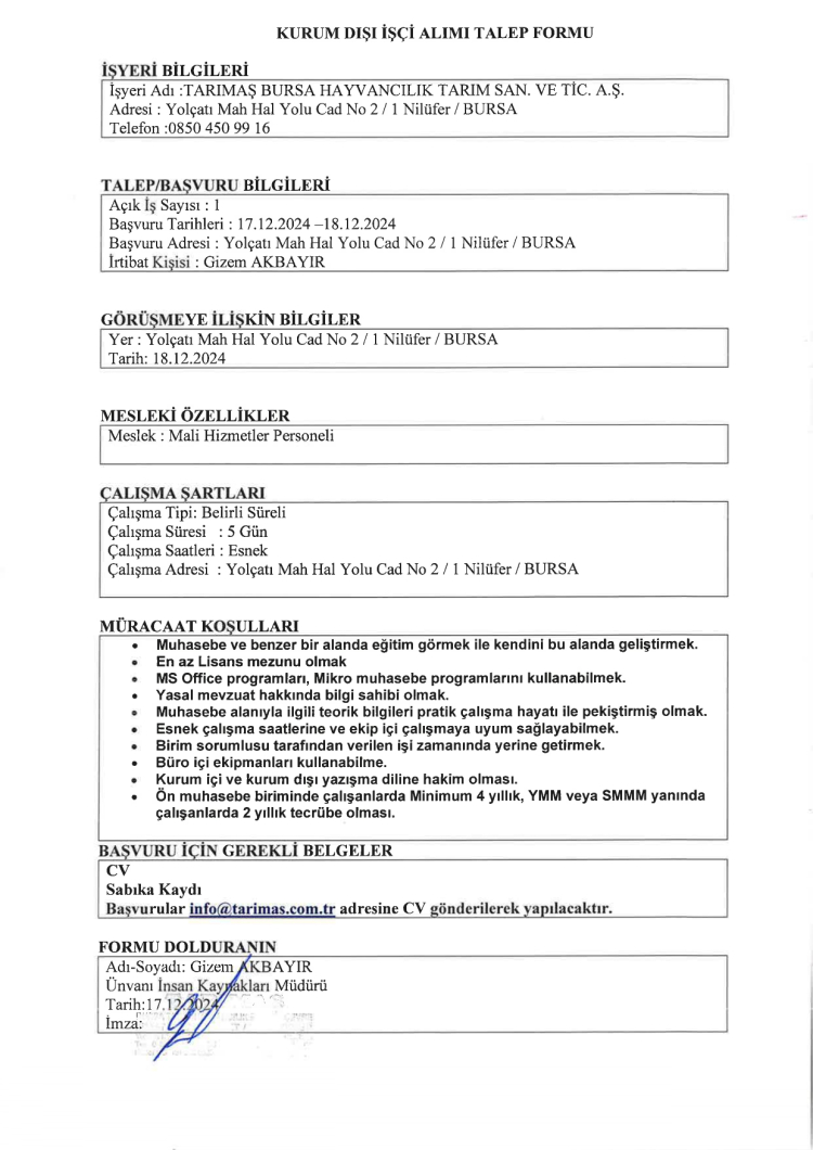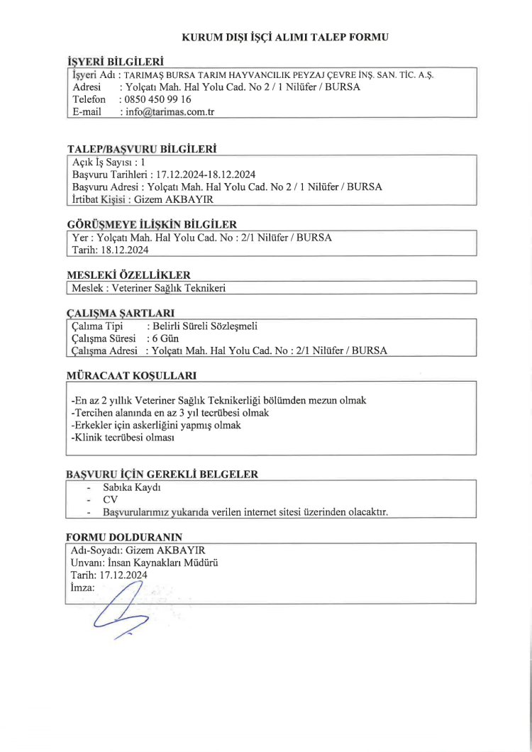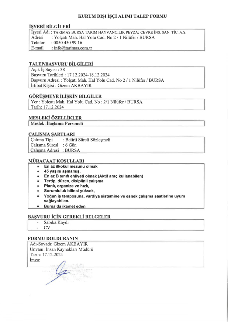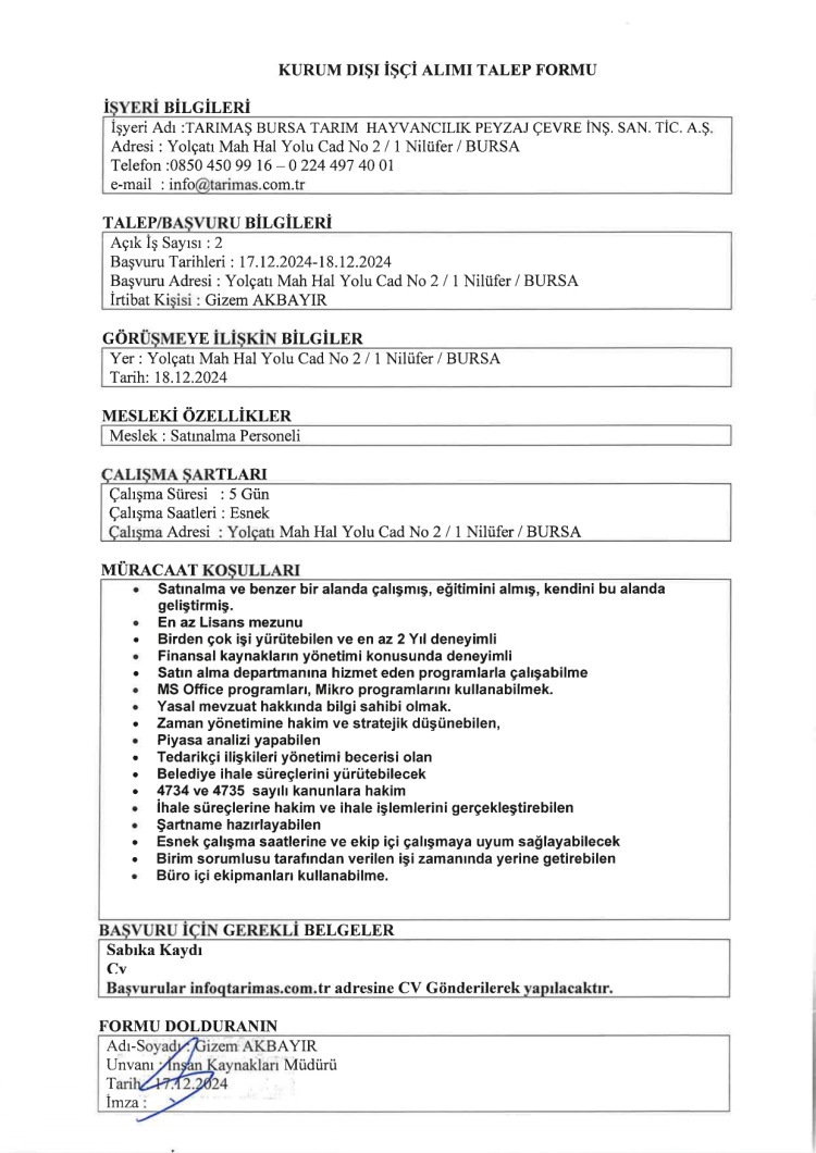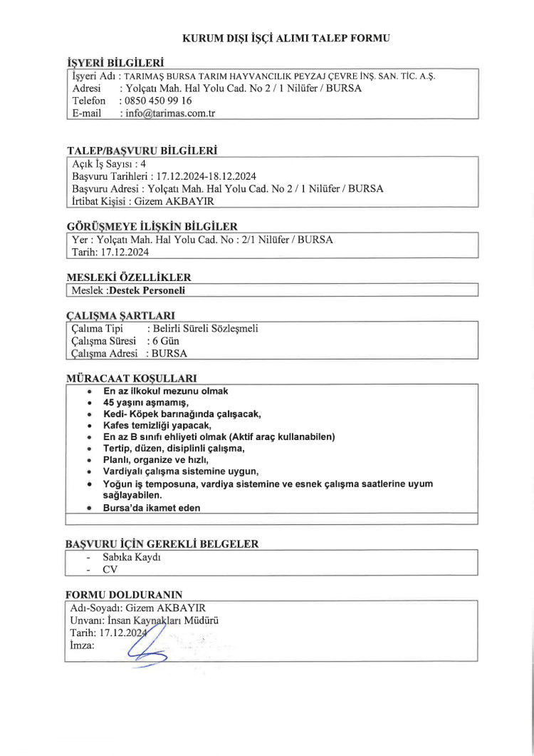 Tarım, hayvancılık, hal işletmesi, park bahçe peyzaj hizmetleri, sahil bakım temizlik hizmetleri, biyosidal ilaçlama, mezarlık bakım hizmetleri ve katı atık nakil hizmeti üzerine faaliyet gösteren şirketin yayımladığı iş ilanlarında KPSS şartı olmadığı, her iş için ayrı ayrı kıstaslar olduğu görüldü.