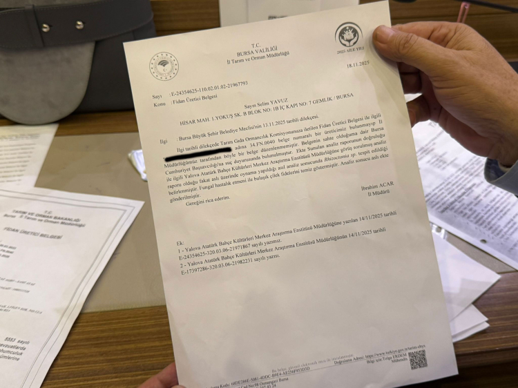 Külcü’nün sunmuş olduğu Bursa İl Tarım ve Orman Müdürlüğü’nden gelen dilekçede şu ifadelere yer verildi: “İlgi tarihli dilekçede Tarım Gıda Ormancılık Komisyonunuza iletilen Fidan Üretici Belgesi ile ilgili ‘A**** **** - S**** ****’ adına 34.FN.0040 belge numaralı bir üreticimiz bulunmayıp İl Cumhuriyet Başsavcılığı’na suç duyurusunda bulunulmuştur. Ekte sunulan analiz raporunun doğruluğu ile ilgili olarak Yalova Atatürk Bahçe Kültürleri Merkez Araştırma Enstitüsü Müdürlüğü’nden görüş sorulmuş analiz raporu olduğu fakat aslı üzerinde oynama yapıldığı, asıl analiz sonucunda Rhizoctonia sp. tespit edildiği belirlenmiştir. Fungal hastalık etmeni ile bulaşık çilek fideleri temiz olarak gösterilmiştir.”