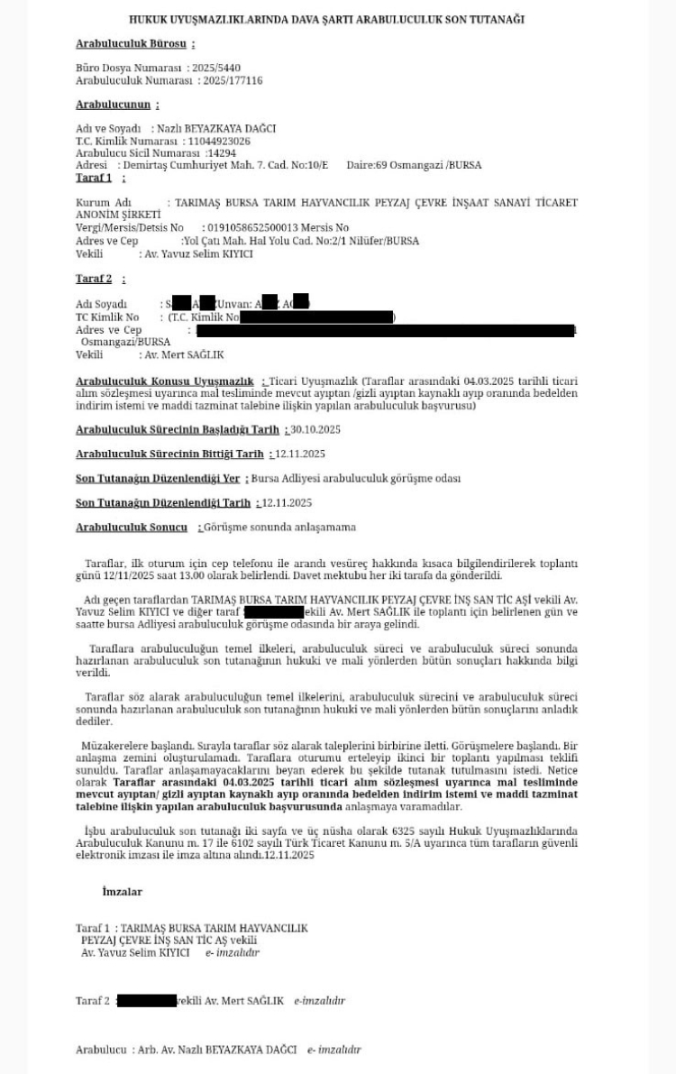 TARIM A.Ş ve sorumlu firma arasında yapılan sözleşmeye göre alınan malların ayıplı olması, bu nedenle bedelden indirim istemi ve maddi tazminat talebine yönelik 12 Kasım 2025 tarihinde yapılan Dava Şartı Arabuluculuk Sonuç Tutanağına göre, taraflar anlaşamadı. Saldız, “Firma yetkilileriyle uzlaşma sağlayamadık; şimdi dava açılacak. Dava, bu süreçler geçilmeden açılmıyor.” ifadelerine yer verdi.