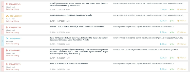 Bursa Ulaşım Toplu Taşım İşletmeciliği Turizm Sanayi ve Ticaret A.Ş.'nin (BURULAŞ) açtığı 569 Adet Toplu Taşıma Aracı İçin Kasko Sigortası Yaptırılması ile Kaza Ve Sorumluluk Sigortası Yaptırılması ihaleleri teknik şartnamenin uygun olmaması nedeniyle iptal edildi.