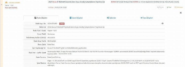 BUSKİ tarafından, "2024 Bursa İli Muhtelif İlçelerde İçme Suyu Sondaj Çalışmalarının Yapılması İşi" başlığıyla açılan ihale Tasarruf Tedbirleri Genelgesi'ne aykırı düzenlemeler içerdiğinden iptal olmuş ve tekrar açılmıştı.
