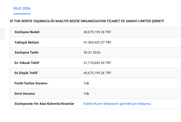 İhalenin kazananı en düşük teklifi sunan 3F Tur Servis Taşımacılığı Nakliye Müzik Organizasyon Ticaret ve Sanayi Limited Şirketi oldu.