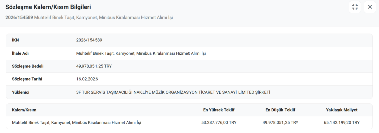 İhalenin kazananı en düşük teklifi sunan 3F Tur Servis Taşımacılığı Nakliye Müzik Organizasyon Ticaret ve Sanayi Limited Şirketi oldu.