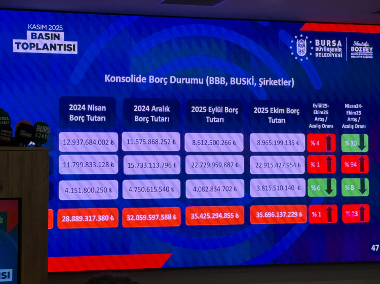 Başkan Bozbey, Nisan 2024, Aralık 2024 ve Eylül 2025 ve Ekim 2025 borçlarını kıyaslayarak duyurduğu yeni tabloda, Büyükşehir Belediyesi'nin Nisan 2024-Eklim 2025 artış/azalış tablosunda yüzde 30'luk bir düşüş gerçekleştiğini açıkladı. Eylül 2025 ile Ekim 2025 arasında ise BBB'nin borcu yüzde 4 oranında arttı.
