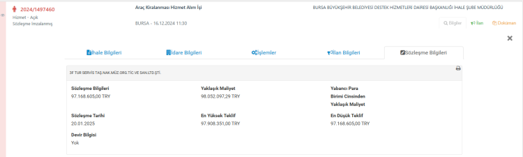 Bursa Büyükşehir Belediyesi'nin çoğunluğu binek 206 adet araç kiralanması için açtığı ihale sonuçlandı. İşte imzalanan sözleşme tutarı...