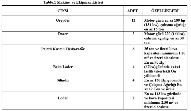 İhale kapsamında 8 adet paletli kırıcılı, kırıcısız veya lastikli ekskavatör, 12 adet greyder, 2 adet dozer, 2 adet loder, 4 adet beko loder ve 4 adet silindir kiralandı.