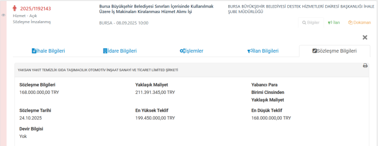 Bursa Büyükşehir Belediyesi'nin açtığı iş makinesi kiralama ihalesinde sözleşme imzalandı.