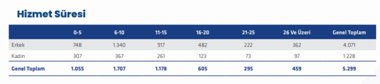 Çalışanların 1.055'i 0-5, 1.707'si 6-10, 1.1.178'i 11-15, 605'i 16-20, 295'i 21-25, 459'u 26 ve üzeri yaşta...