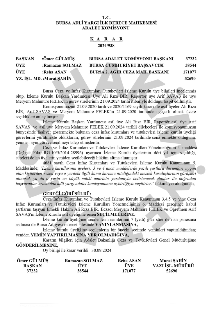 Görev süreleri dolan Bursa Ceza ve İnfaz Kurumları Tutukevleri İzleme Kurulu üyelerinin yeniden aynı göreve seçilme talepleri kabul edildi.