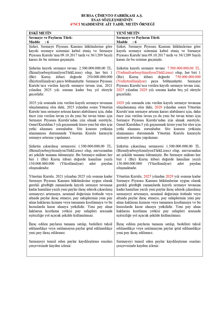Bursa Çimento Fabrikası Anonim Şirketi, kayıtlı sermayesinin tavanını 5 milyar TL artırma kararı aldı.