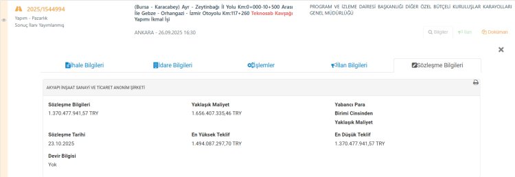 Program ve İzleme Dairesi Başkanlığı'nın‘21-b pazarlık’ usulüyle yürüttüğü ihaleyi, 1 milyar 370 milyon TL bedelle Akyapı İnşaatSanayi ve Ticaret Anonim Şirketi kazandı.