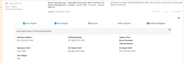 Akyapı, daha önce de 2022 yılında aynı güzergahı kapsayan “(Bursa-Karacabey) Ayr - Zeytinbağı İl Yolu Km:0+000-10+500 Arası ile Gebze-Orhangazi-İzmir Otoyolu Km:117+260 Teknosab Kavşağı Yapım İşi” başlıklı ihaleyi 815 milyon TL bedelle kazanmıştı.