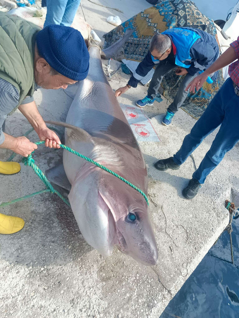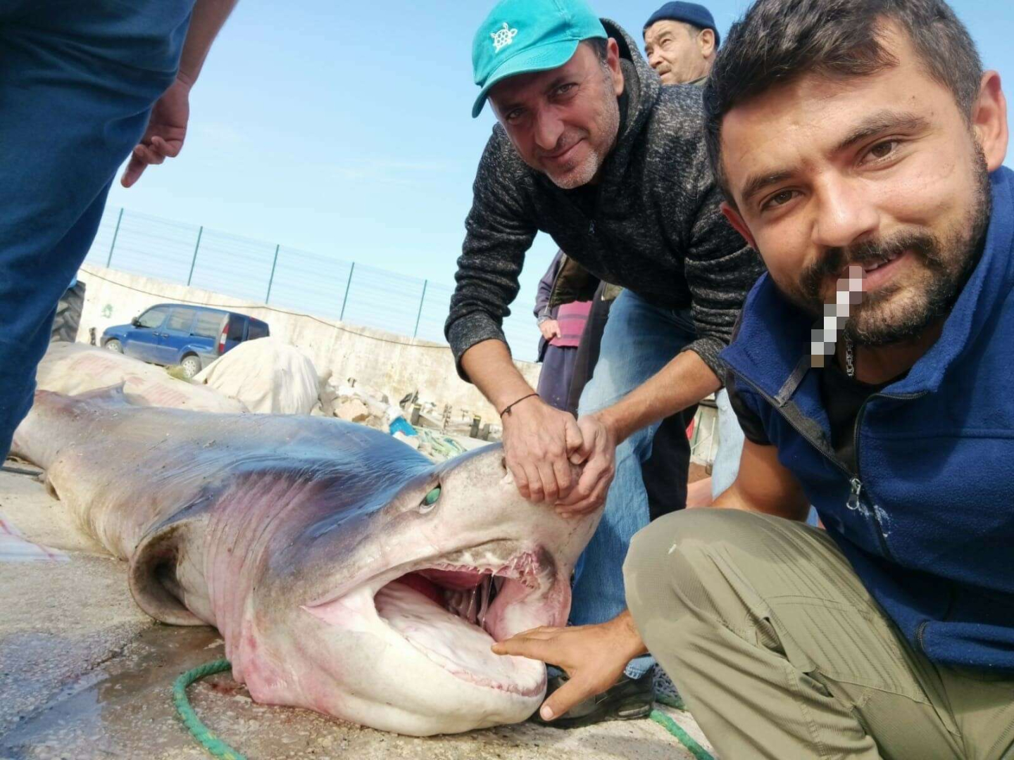 Diğer balıklarla birlikte gemiye çekilen köpekbalığı Kurşunlu'daki balıkçı barınağına getirildi.
