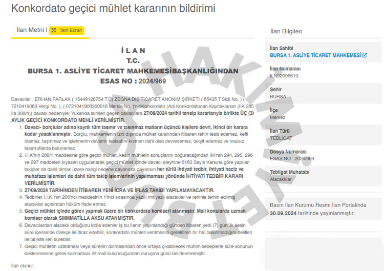 Borçlarını ödemekte zorlanan ve finansal dengesi altüst olan Zegna Dış Ticaret Anonim Şirketi borçlarını yeniden yapılandırıp düzlüğe çıkabilmek için Bursa 1. Asliye Ticaret Mahkemesi'ne konkordato talebiyle başvurdu.