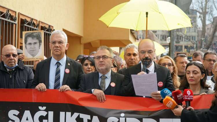 Saat 12.30’da Setbaşı’nda toplanan hekimler adına açıklamayı Bursa Tabip Odası Başkanı Dr. Levent Tufan Kumaş gerçekleştirdi.