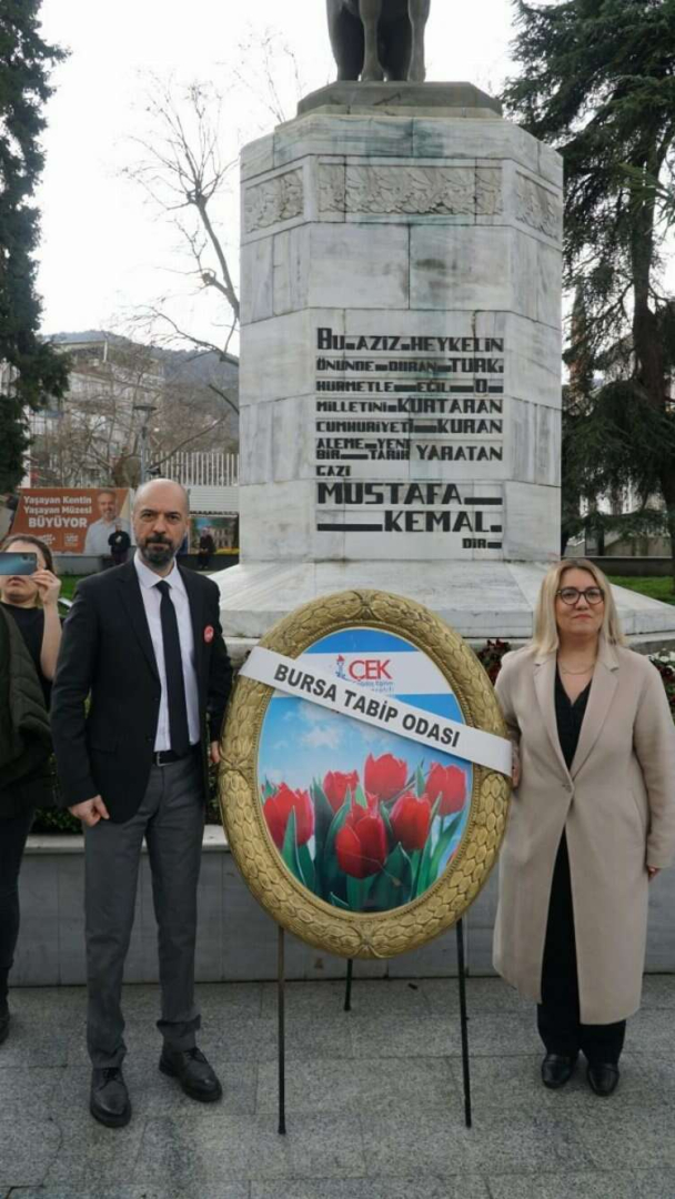 Saygı duruşu ve İstiklal Marşı’nın okunmasının ardından BTO Başkanı Dr. Levent Tufan Kumaş ve Bursa Uludağ Üniversitesi Tıp Fakültesi Dekanı Prof. Dr. Necmiye Funda Coşkun, Atatürk Anıtı’na çelenk bıraktılar.