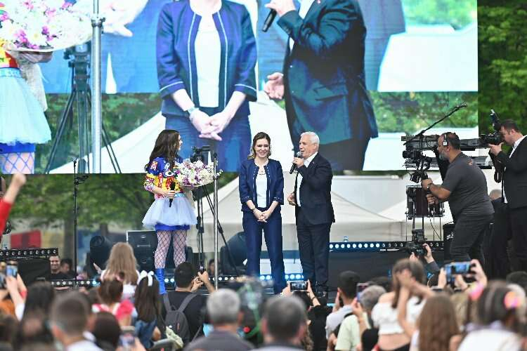 Bursa Büyükşehir Belediye Başkanı Mustafa Bozbey, konser sırasında sahneye çıkarak ünlü şarkıcı Nil Karaibrahimgil’e çiçek takdim etti. Dünya çocuklarının 23 Nisan Ulusal Egemenlik ve Çocuk Bayramı’nı kutlayan Başkan Bozbey, “Gülümseyen yüzleriyle bugün burada bir araya gelen sevgili çocuklar, bugün sizin bayramınız. Doyasıya eğlenmek hakkınız. Başta Ulu Önderimiz Gazi Mustafa Kemal Atatürk ve yol arkadaşları olmak üzere Cumhuriyetimizin ve millî egemenliğimizin mimarı olan şehit ve gazilerimizi rahmet, minnet ve saygıyla anıyorum. Tüm çocuklar aynı dilde gülümser diyerek 23 Nisan Ulusal Egemenlik ve Çocuk Bayramı’nızı kutluyorum’’ dedi.