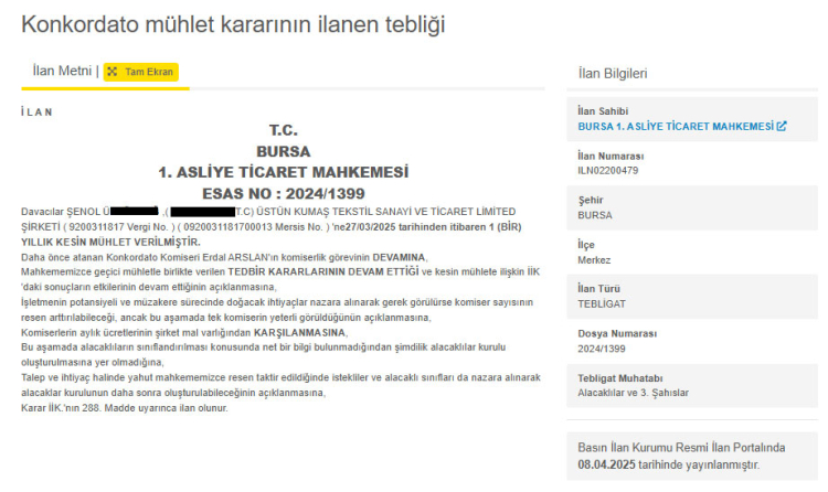Üstün Kumaş borçlarını yeniden yapılandırıp düzlüğe çıkabilmek için Bursa 1. Asliye Ticaret Mahkemesi'ne konkordato talebiyle başvurdu.
