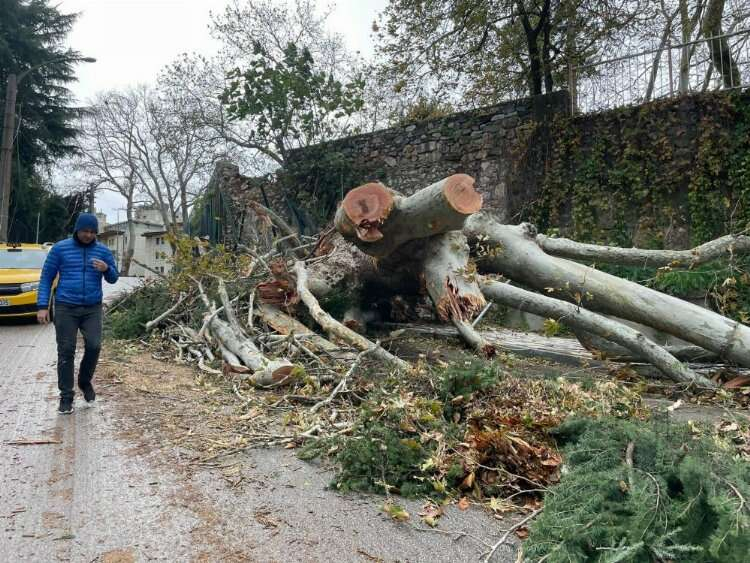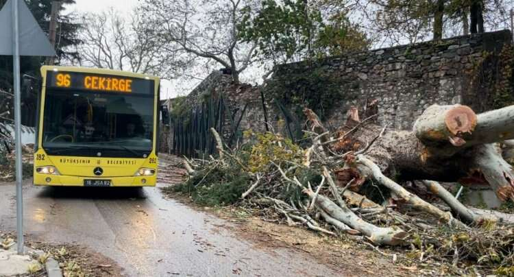 Bursa'da 510 yıllık geçmişi bulunan tarihi Hüsnügüzel Kaplıcası'nın bahçesindeki 250 yıllık anıt çınar ağacı fırtınaya dayanamadı. Saatteki hızı 95 kilometreye ulaşan fırtına sebebiyle devasa çınar kökünden koparak yola devrildi. Ekipler ağacın dallarını keserek trafiği açtı.