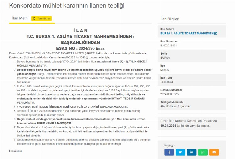 Buna göre Bursa'da faaliyet gösteren birisi tekstil şirketi diğeri ise mobilya firması olan 3 firmanın konkordato kararları onaylanarak 3 aylık geçici mühlet verildi.