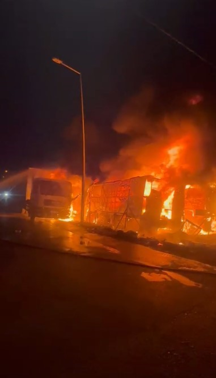 Bursa'nın Osmangazi ilçesinde park halindeki 3 kamyon ve 1 tır alev alev yandı, ortalık savaş alanına döndü.