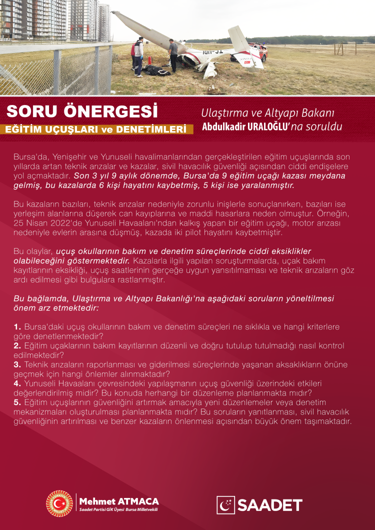 Bursa Milletvekili Mehmet Atmaca, Yenişehir ve Yunuseli havalimanlarından gerçekleştirilen eğitim uçuşlarında artan kazaları Türkiye Büyük Millet Meclisi gündemine taşıdı.