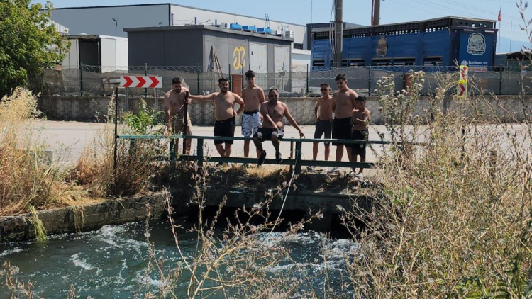 Denize ya da havuza ulaşma imkanı olmayan bazı gençler ise çareyi Fevzidede Mahallesi'ndeki tarımsal sulama kanalında buldu.