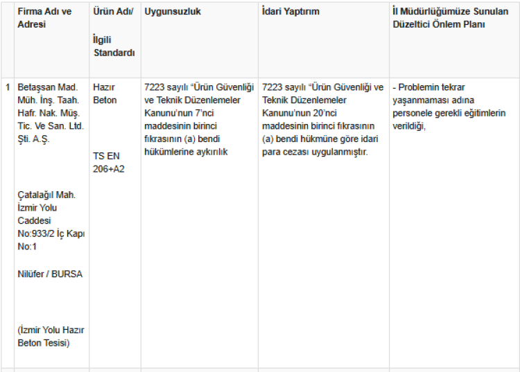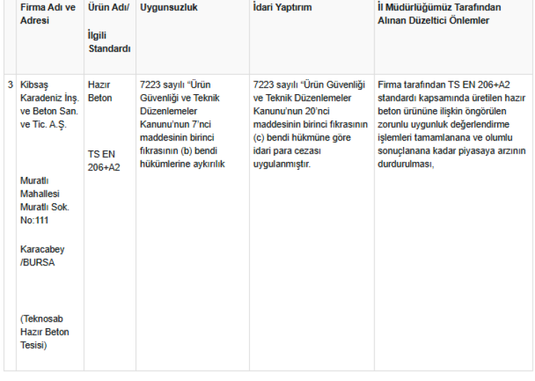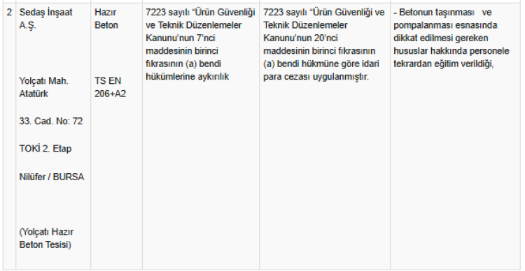 Bursa'da faaliyet gösteren Sedaş İnşaat Anonim Şirketi (1981), Betaşsan Madencilik, Mühendislik, İnşaat, Taahhüt, Hafriyat, Nakliye, Müşavirlik Ticaret Ve Sanayi Limited Şirketi (2005) ile Kibsaş Karadeniz İnşaat ve Beton Sanayi ve Ticaret Anonim Şirketi'nin (2011) ürettiği TS EN 206+A2 hazır betonda 7223 sayılı “Ürün Güvenliği ve Teknik Düzenlemeler Kanunu’nun 7’nci maddesinin birinci fıkrasının (a) ve (b) bendi hükümlerine aykırılık tespit edildiği bildirildi.