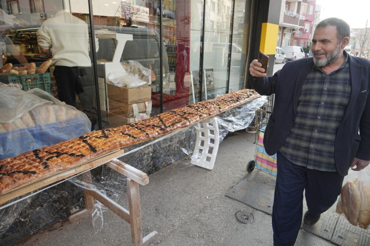 7 metrelik pideyi gören vatandaşlar cep telefonu ile fotoğrafını çekti.