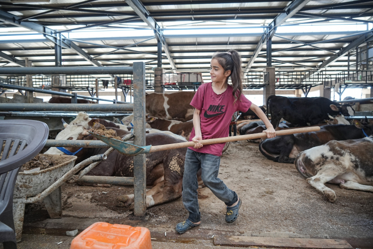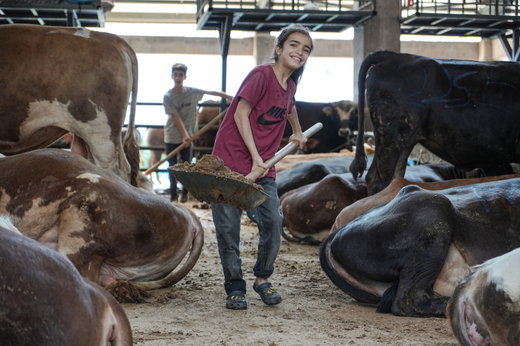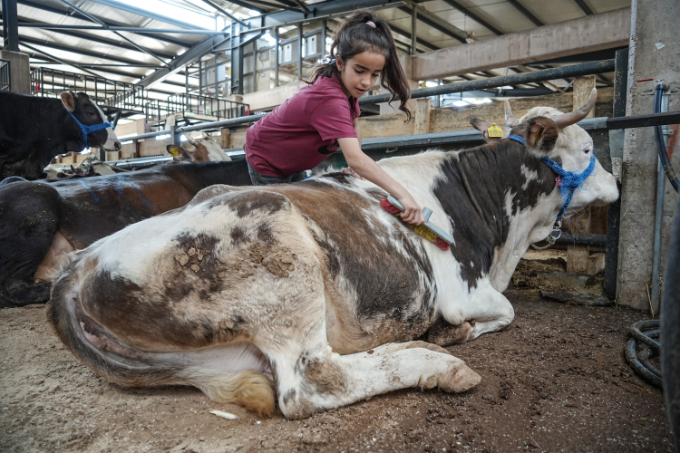 Büyükbaş hayvanların yemlenmesi, sulanması ve temizliği gibi işleri büyük bir sorumlulukla yerine getiren kardeşler, yaşlarının çok ötesinde bir gayret gösteriyor.