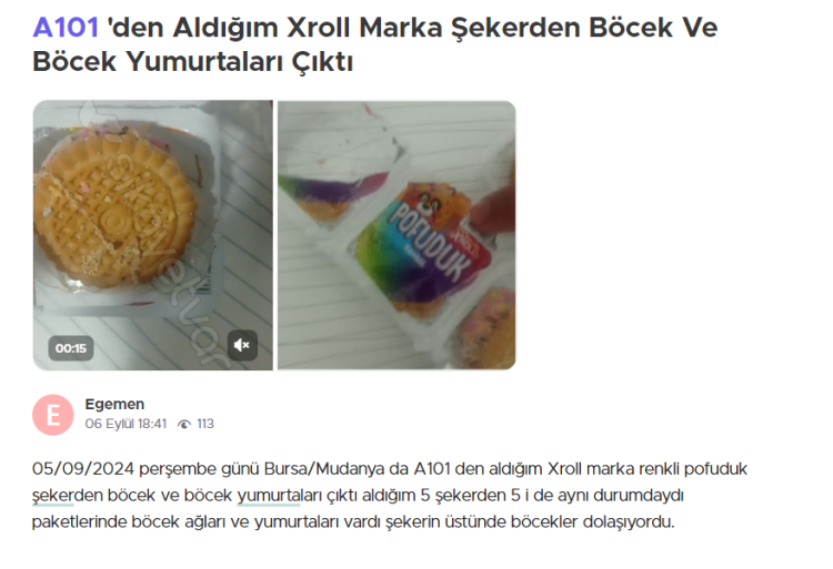Egemen adlı bir vatandaş marketten aldığı Marşmelovlu pofuduk bisküvilerden canlı kurtçuklar ve böcek yumurtaları çıktığını öne sürdü.