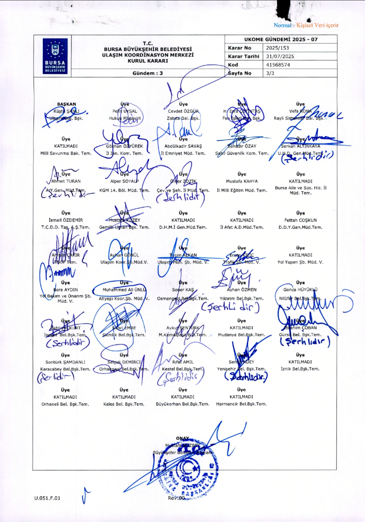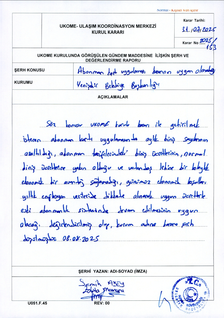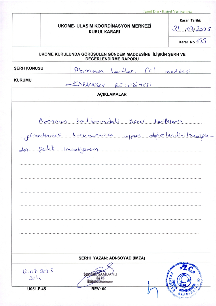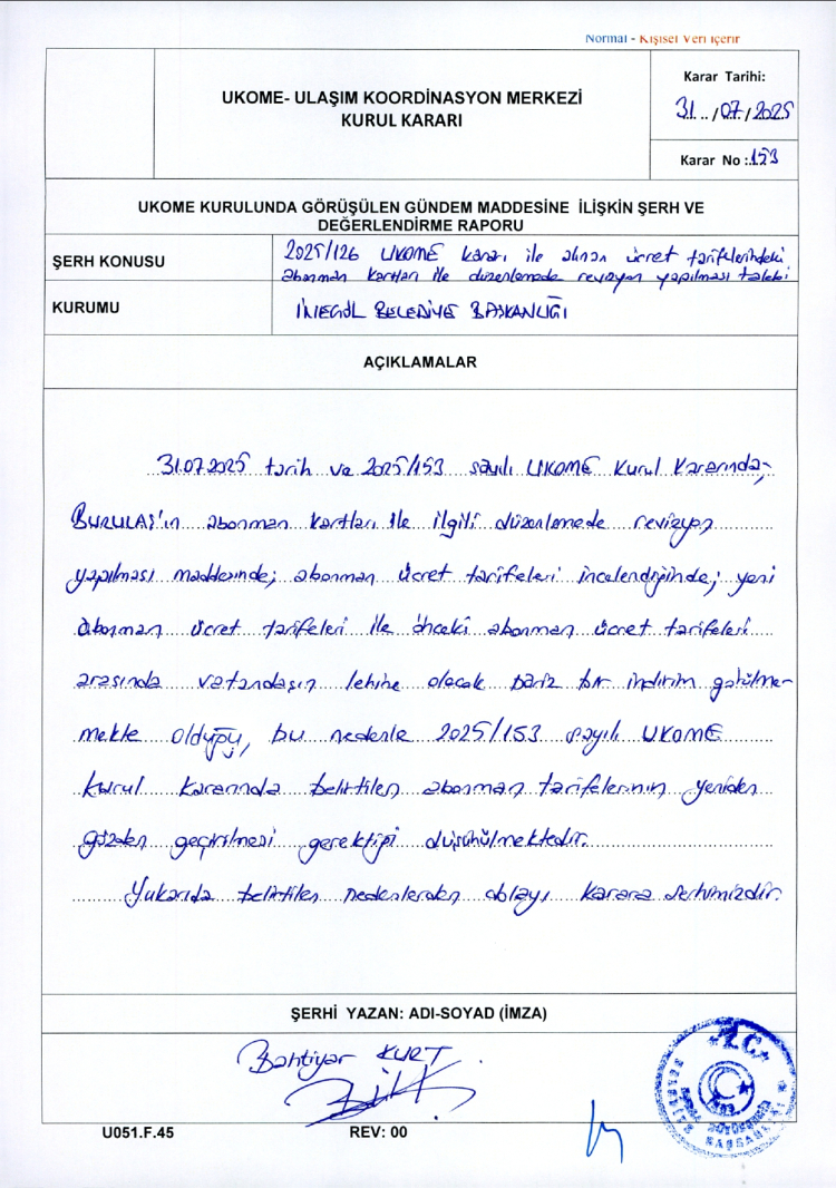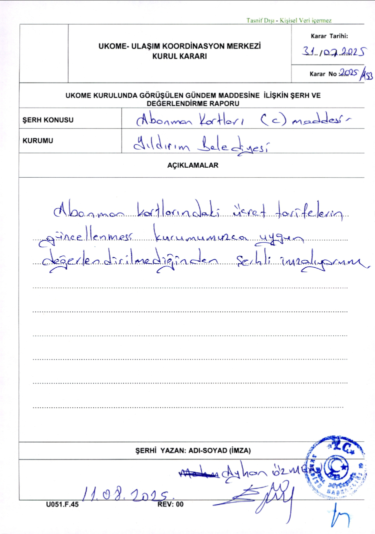 31 Temmuz günü Ulaşım Dairesi Başkanı Rüştü Şanlı Başkanlığı'nda toplanan UKOME Kurulu'nun aldığı kararlar geçtiğimiz günlerde yayımlandı.