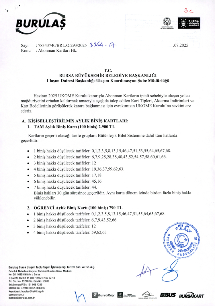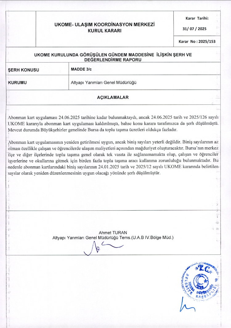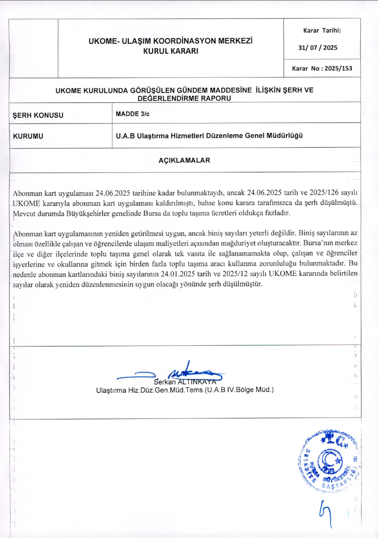 Bursa Büyükşehir Belediyesi Ulaşım Koordinasyon Merkezi'nin (UKOME), toplu taşıma araçlarındaki abonman biniş hakkının düşürülmesi ve yeni ücret tarifelerine yönelik verdiği karara bazı yetkililer şerh düştü. Biniş hakkının azaltılmasının özellikle çalışan ve öğrencilerde ulaşım maliyetleri açısından mağduriyet oluşturacağı ifade edildi.