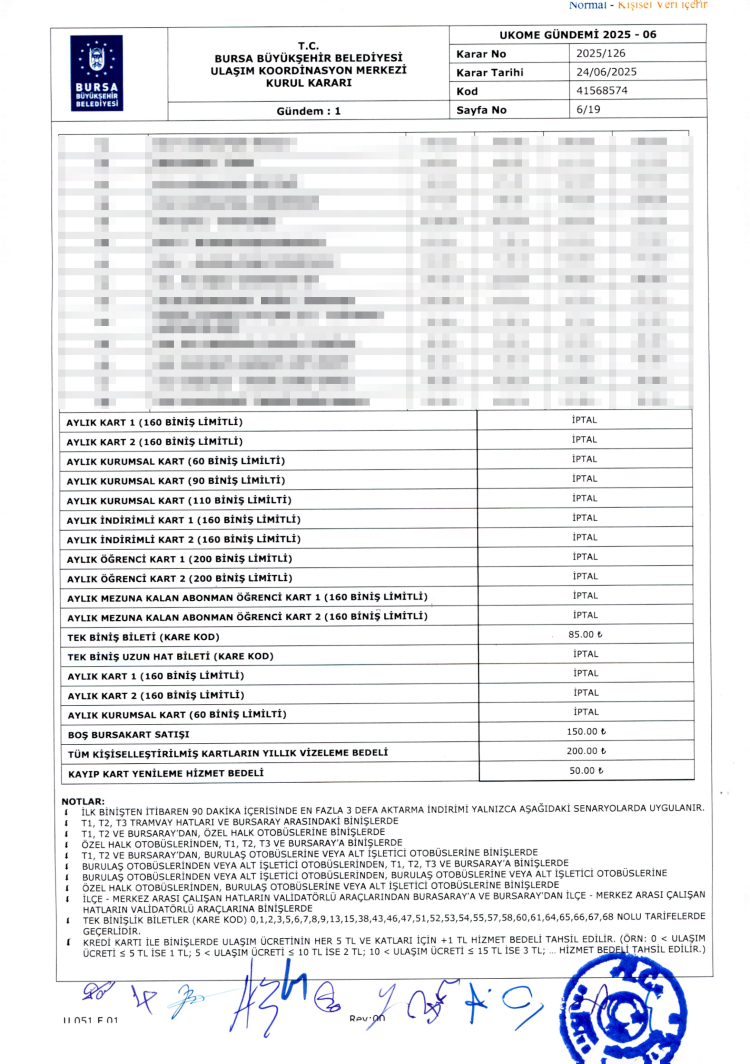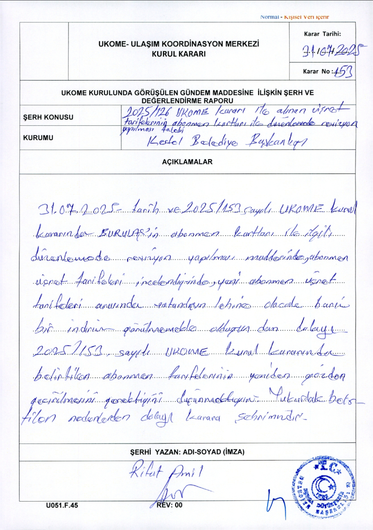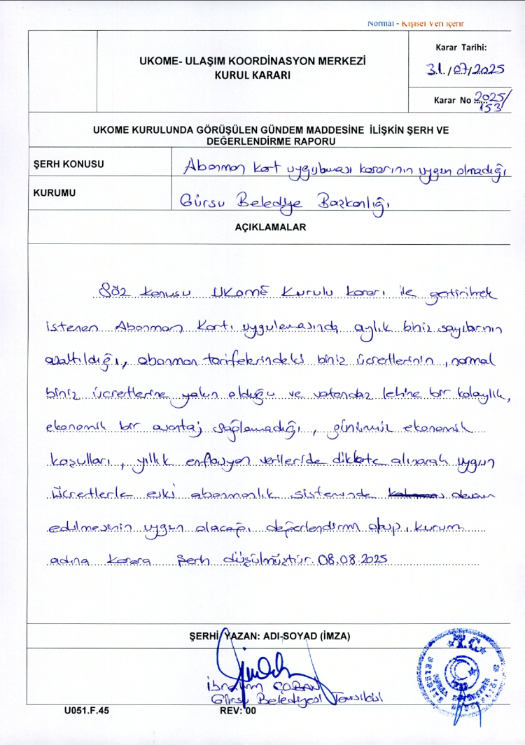 Yayımlanan kararlar arasında BURULAŞ'ın toplu taşıma ücret tarifesindeki abonman kartları ile ilgili düzenlemede revizyon yapılması talebi de yer aldı.