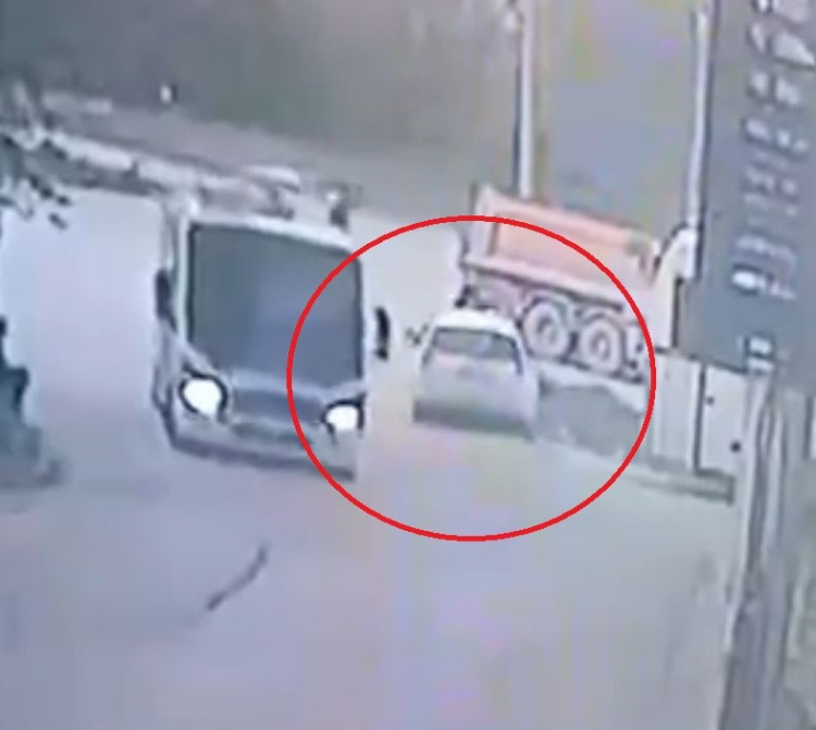 Bursa'da bir otomobil sürücüsü karşıdan gelen otobüse çarpmamak için manevra yapınca, yolda yürüyen kadına çarptı. Savrulan kadın yaralanırken, panikleyen sürücü başka araçlara çarparak durabildi. Kaza bir iş yerine ait güvenlik kamerasına anbean yansıdı.