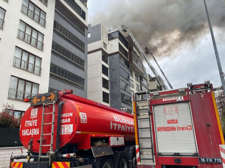Bursa’da 6 katlı bir binanın çatı katında çıkan yangında, metrelerce yüksekte alevlerin arasında mahsur kalan bir işçinin kurtarıldığı anlar ortaya çıktı. Yangının, tadilat sırasında kullanılan yanıcı polyester ve zift malzemelerinin oluşturduğu ısı nedeniyle başladığı belirlendi. Alevler 1 saati aşkın müdahale sonrası kontrol altına alınırken, dumandan etkilenen 2 işçi hastaneye kaldırıldı. Söndürme çalışmasına 17 itfaiye aracı katıldı.