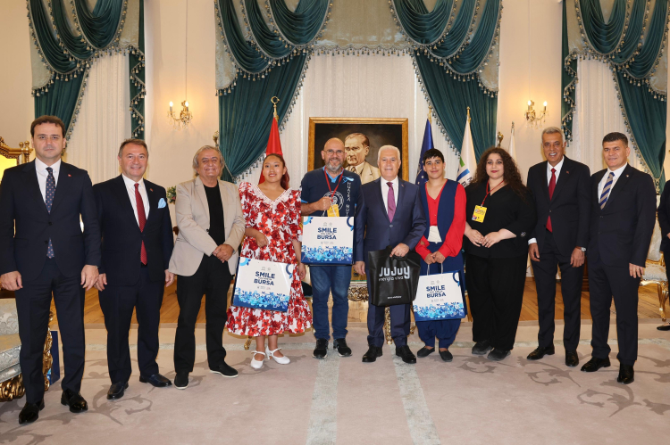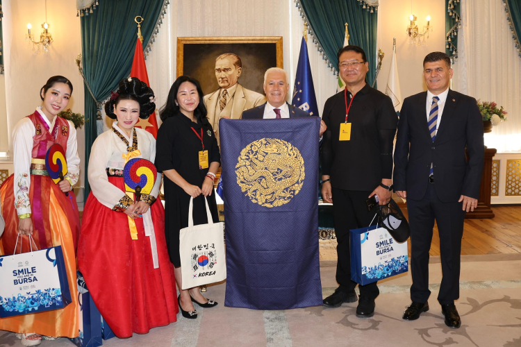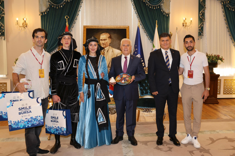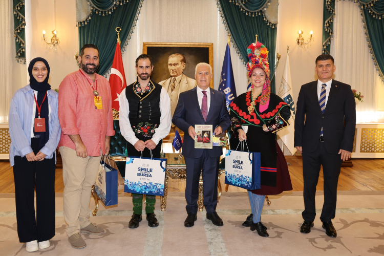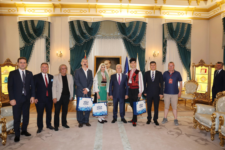 Bursa Büyükşehir Belediyesi adına Bursa Kültür Sanat ve Turizm Vakfı (BKSTV) tarafından düzenlenen 37. Uluslararası Altın Karagöz Halk Dansları Yarışması'na katılan ülkelerin temsilcileri ve yarışmanın jüri üyeleri, Bursa Büyükşehir Belediye Başkanı Mustafa Bozbey’i Tarihi Belediye Binası’nda ziyaret etti.