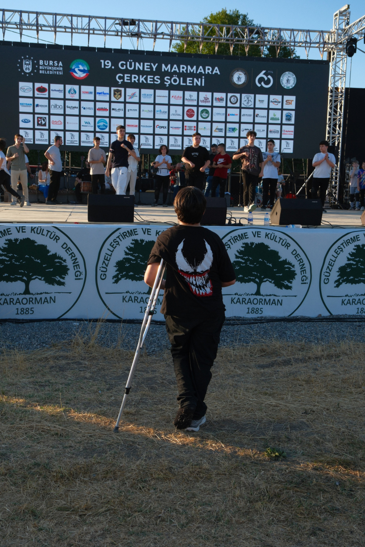 Bursa'da düzenlenen 19. Güney Marmara Çerkes Şöleni'nde izleyenlerin yüreğini burkan bir an yaşandı. Bugüne kadar arkadaşları ile birlikte sahne alan genç, ayağını kırınca gösteriye katılamadı. Koltuk değnekleriyle tören alanına gelen genç, prova yapan arkadaşlarına uzaktan eşlik etti.