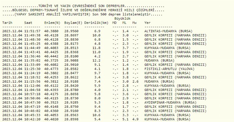Boğaziçi Üniversitesi Kandilli Rasathanesi ve AFAD'ın verilerine göre Bursa'da artçı sarsıntılar sürüyor.