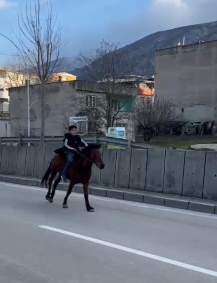 Sol şeritten dört nala koşturduğu atıyla kilometrelerce ilerleyen genç, trafikte seyreden otomobil sürücülerini şaşkına çevirdi.
