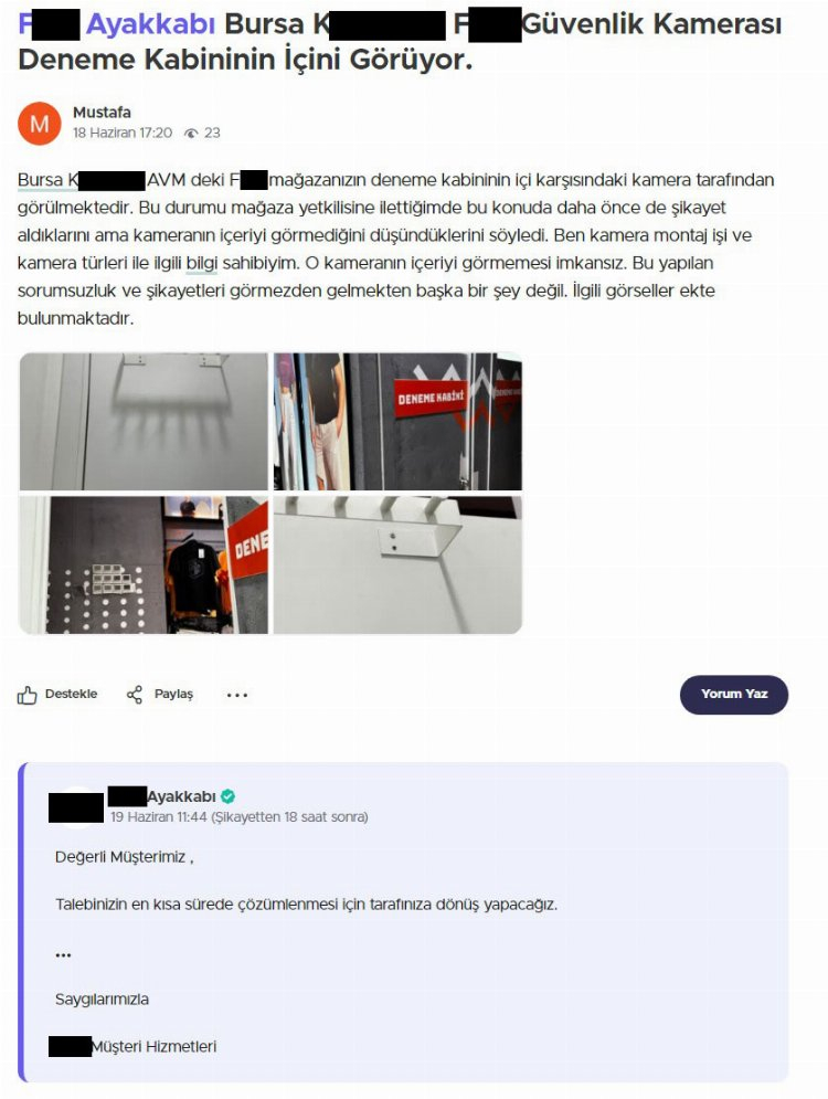 Bursa K******* AVM'deki F** mağazanızın deneme kabininin içi karşısındaki kamera tarafından görülmektedir. Bu durumu mağaza yetkilisine ilettiğimde bu konuda daha önce de şikayet aldıklarını ama kameranın içeriyi görmediğini düşündüklerini söyledi. Ben kamera montaj işi ve kamera türleri ile ilgili bilgi sahibiyim. O kameranın içeriyi görmemesi imkansız. Bu yapılan sorumsuzluk ve şikayetleri görmezden gelmekten başka bir şey değil. İlgili görseller ekte bulunmaktadır.