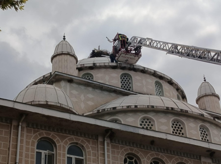 Orhaniye Mahallesi'nde caminin yuvasına yuva kuran leyleğin ayağı, yuvanın kenarına sıkıştı. Leyleğin çırpınışlarını fark eden mahalle muhtarı Mehmet Duman, durumu itfaiyeye bildirdi.